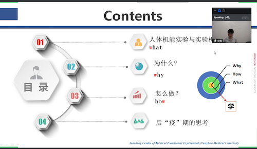 紧接着,温州医科大学基础医学国家级实验教学中心副主任范小芳,也是中国病理生理学会机能实验教学工作委员会副主任委员兼秘书长,以“人体机能实验的开展和体会”为主题,分享了她在人体机能学领域的教学经验。范小芳老师以各种人体教学应用案例介绍了“什么是”,“为什么”,“怎么做”人体机能实验教学,同时探讨了“后疫期”的思考,创新线上线下混合式实验教学,深度拓展实验教学的时间与空间。