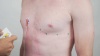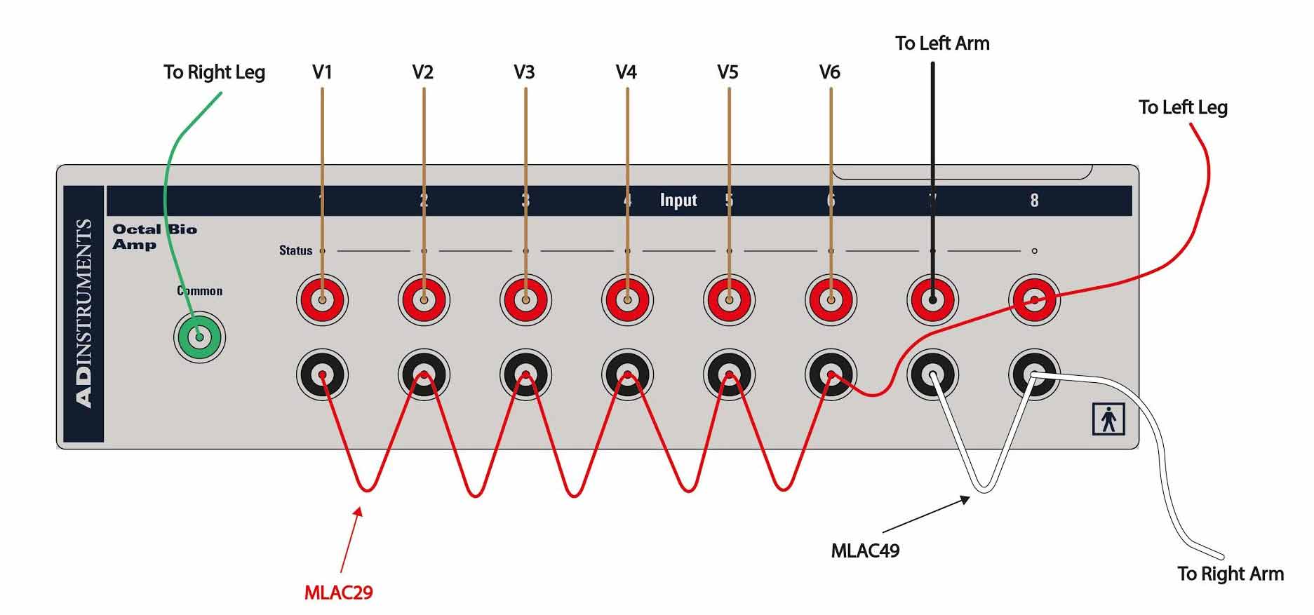 请注意,MLAC49 连接导线有两个额外的1.5mm防触摸插头,不能用于此配置。在使用过程中,这些插头可以保持不插电并悬挂在连接导线上。 现在,MLA0311 导线可以连接到连接导线和生物电放大器输入上,如图所示,并将 MLA1010 ECG 电极连接到主体上的相应记录位置。