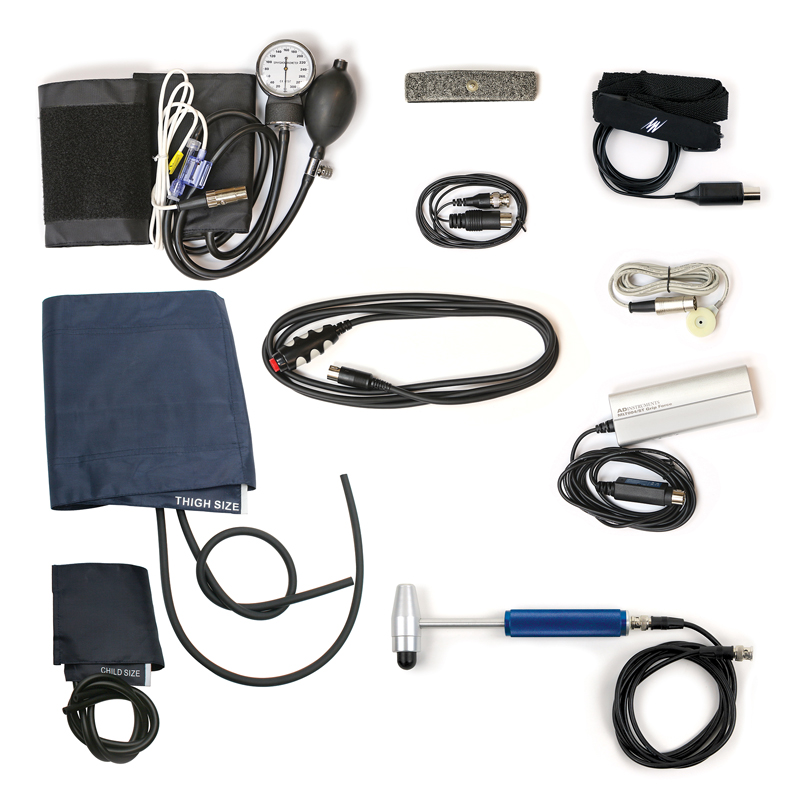 适用于调查和记录一些关于人体受试者的生理学实验课。能够进行的实验包括但不限于通气率、握力、血压、心音、反应时间和需要机械刺激的反射。