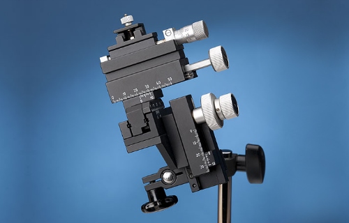 每个微型操纵器有三个堆叠的不锈钢滚珠轴承滚道,可进行 X、Y 和 Z 轴的移动。齿条和小齿轮传动减少齿隙,可快速定位并延长使用寿命。所有三个控制旋钮均可实现精细控制,且位于单一平面,用于单手控制单个仪器,而不需要从显微镜上移开操作人员的眼睛。多个微型操纵器与所有的控制旋钮紧密地并排放置,方便使用。