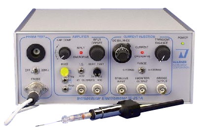 IE-251A-V 的电桥平衡电路允许在两个范围内通过微电极电阻 (高达1000 MΩ)同时刺激和记录。刺激输入处电压将转换为应用于电极的恒流。 电流注入伪影的稳态和瞬态分量与直流和瞬态平衡控制无关。在单端桥输出端查看校正后的信号。从直流平衡十匝刻度读取电极电阻。